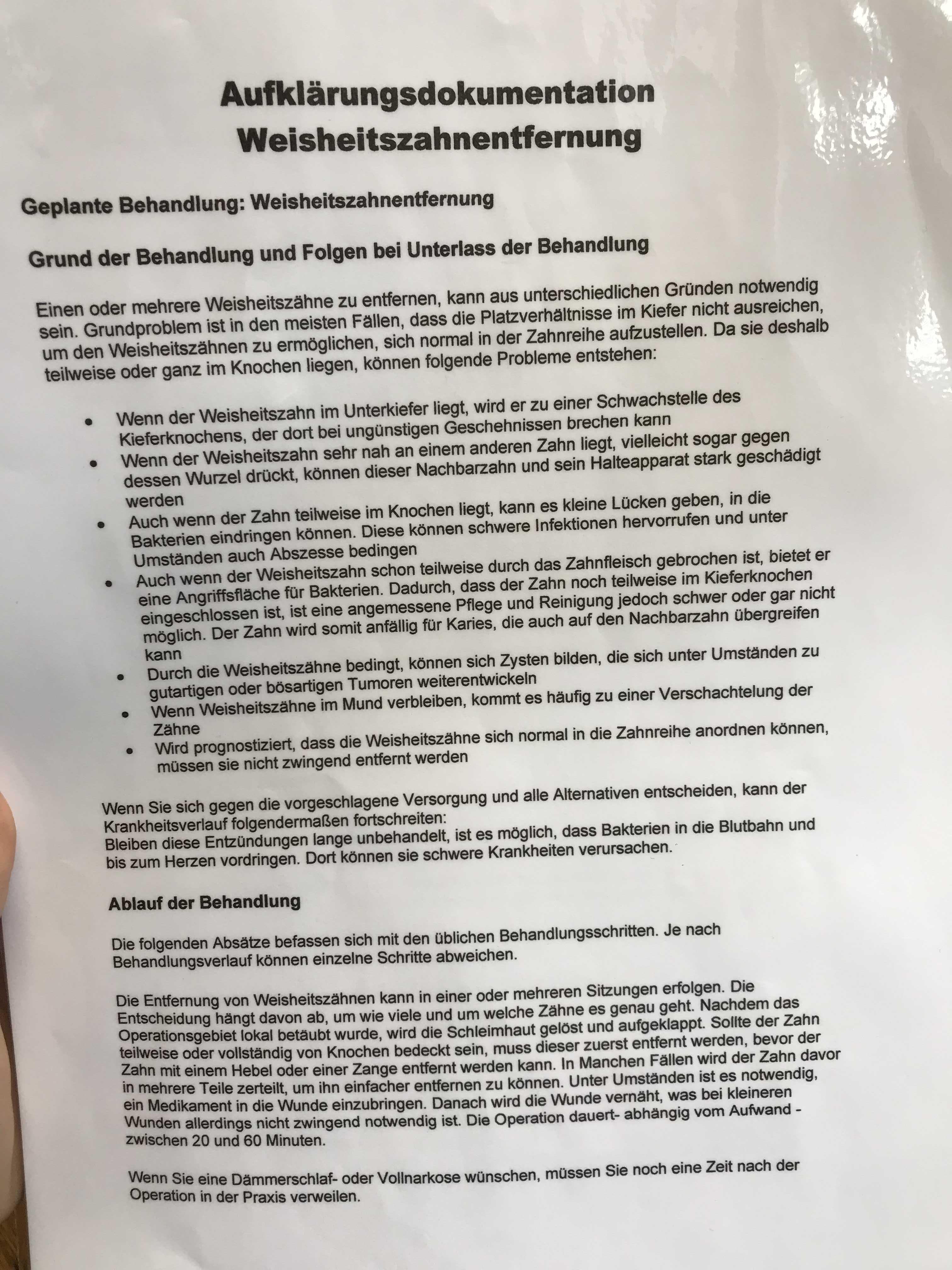 붓기는 초반에 거의 없다가 48시간 후 정도에 가장 심했고 거의 셋째날 까지는 입이 제대로 안 다물어져서 거의 계속 입을 살짝 벌린 상태로 지냈다. 음식은 Apfelmus, Kartoffelpüre, klare Suppe 등 거의 안 씹고 넘길 수 있는 것들을 먹었고 넷째 날쯤부터 일반식을 먹었다. 하지만 입이 제대로 안 벌려져서 계속 티스푼으로 먹었다.