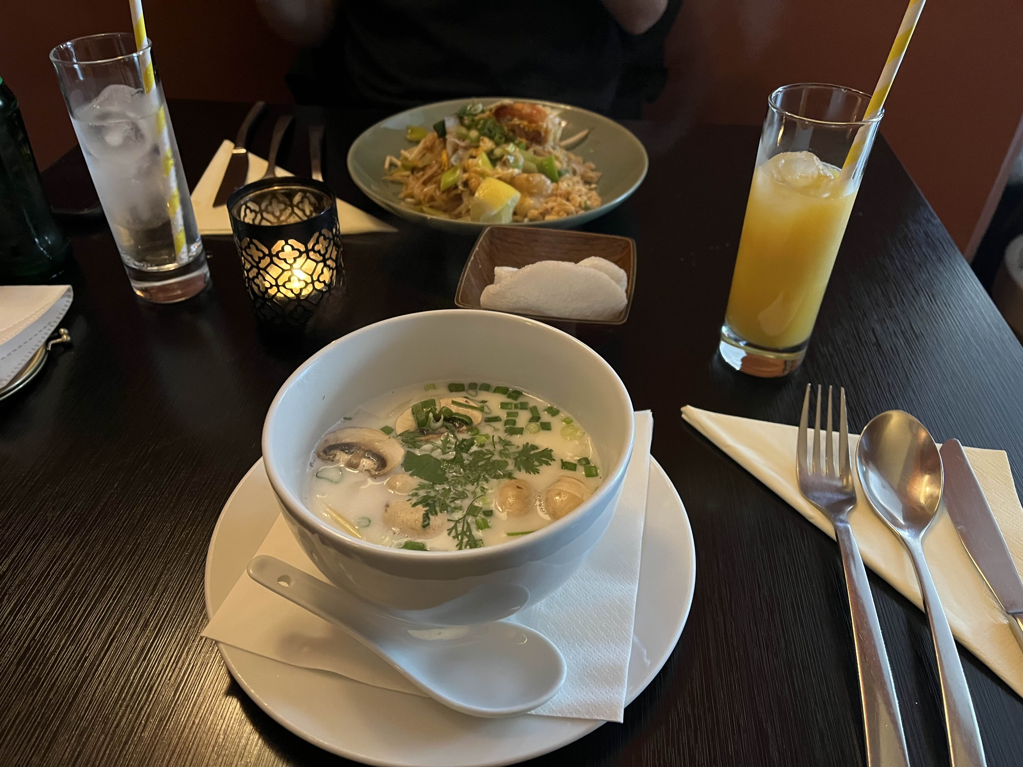팟타이와 똠 카 까이라는 닭 수프를 먹었다.