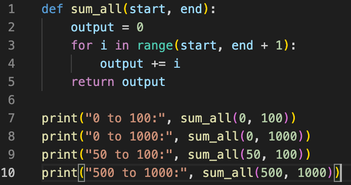 4주차 기본미션: p223 [직접 해보는 손코딩: 범위 내부의 정수를 모두 더하는 함수] 실행 후 코드가 입력된 화면 및 실행 결과 화면 캡쳐하기